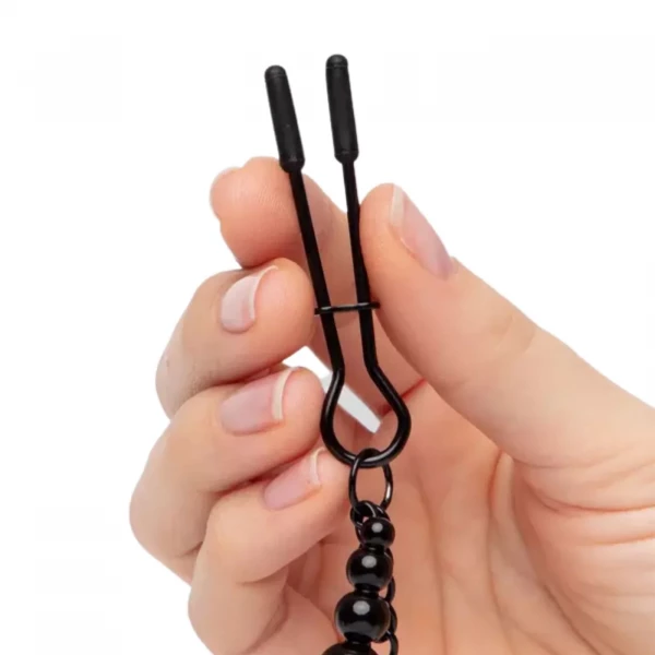 Зажимы на соски на черной металлической цепочке позволят испытать полный спектр неверотяных ощущений от стимуляции груди! Силиконовые наконечники нежно захватывают сосок, а регулировка степени сжатия позволяет экспериментировать с ощущениями. На каждом зажиме расположен металлический утяжелитель, который значительно увеличивает яркие переживания